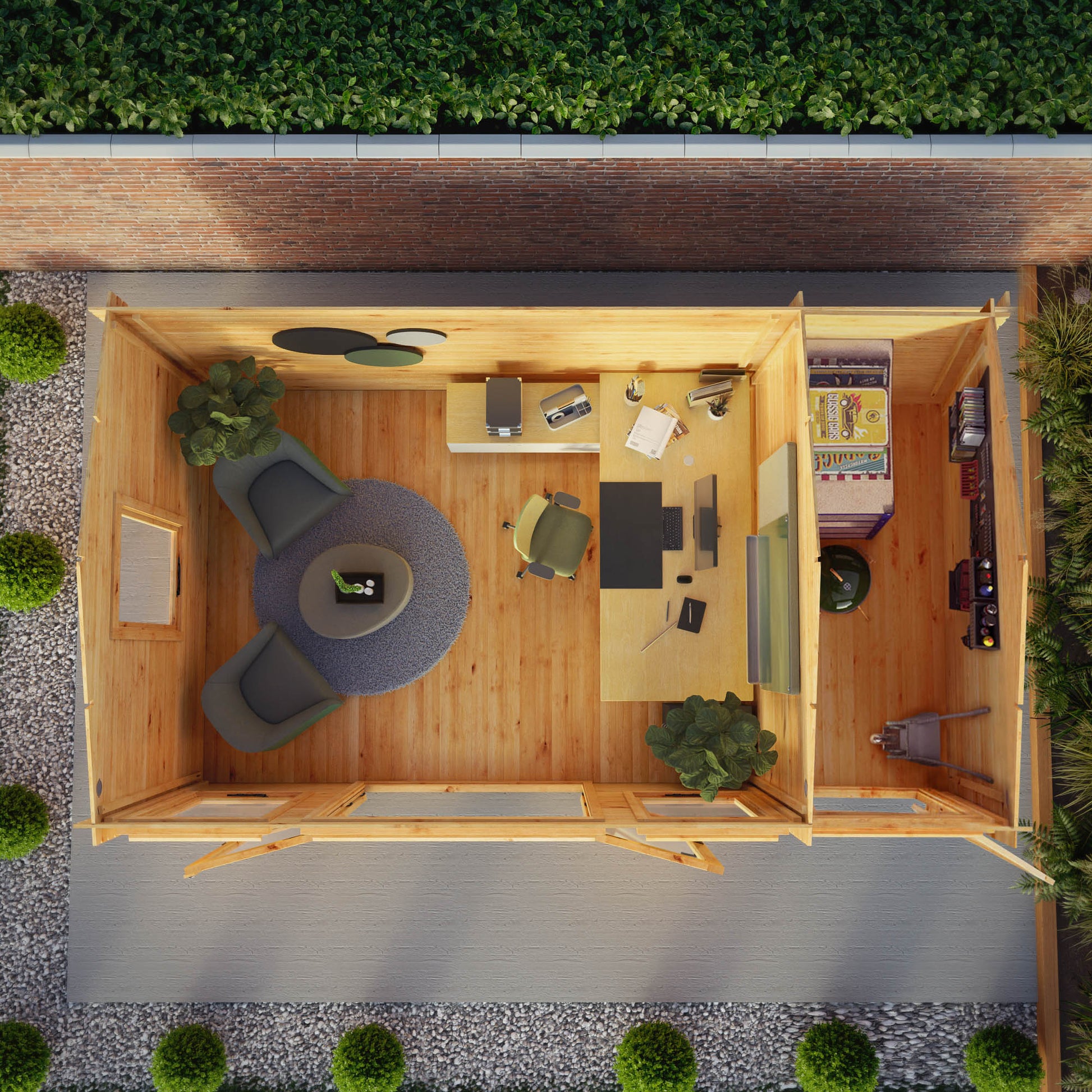 The Mercia 17 x 10 (5.1m x 3m) Reverse Apex Log Cabin With Side Shed - 19mm logs is a versatile and stylish log cabin, designed to provide both living space and practical storage. Its contemporary reverse apex roofline enhances its modern look, while the side shed offers additional functionality for keeping your garden tidy and organised. Whether you use the cabin as a home office, hobby room, gym, or entertaining space, the adjoining side shed is perfect for storing garden tools, equipment, or children’s toys. Large SAN styrene-glazed windows and double doors allow plenty of natural light to flood in, creating a bright and welcoming interior.