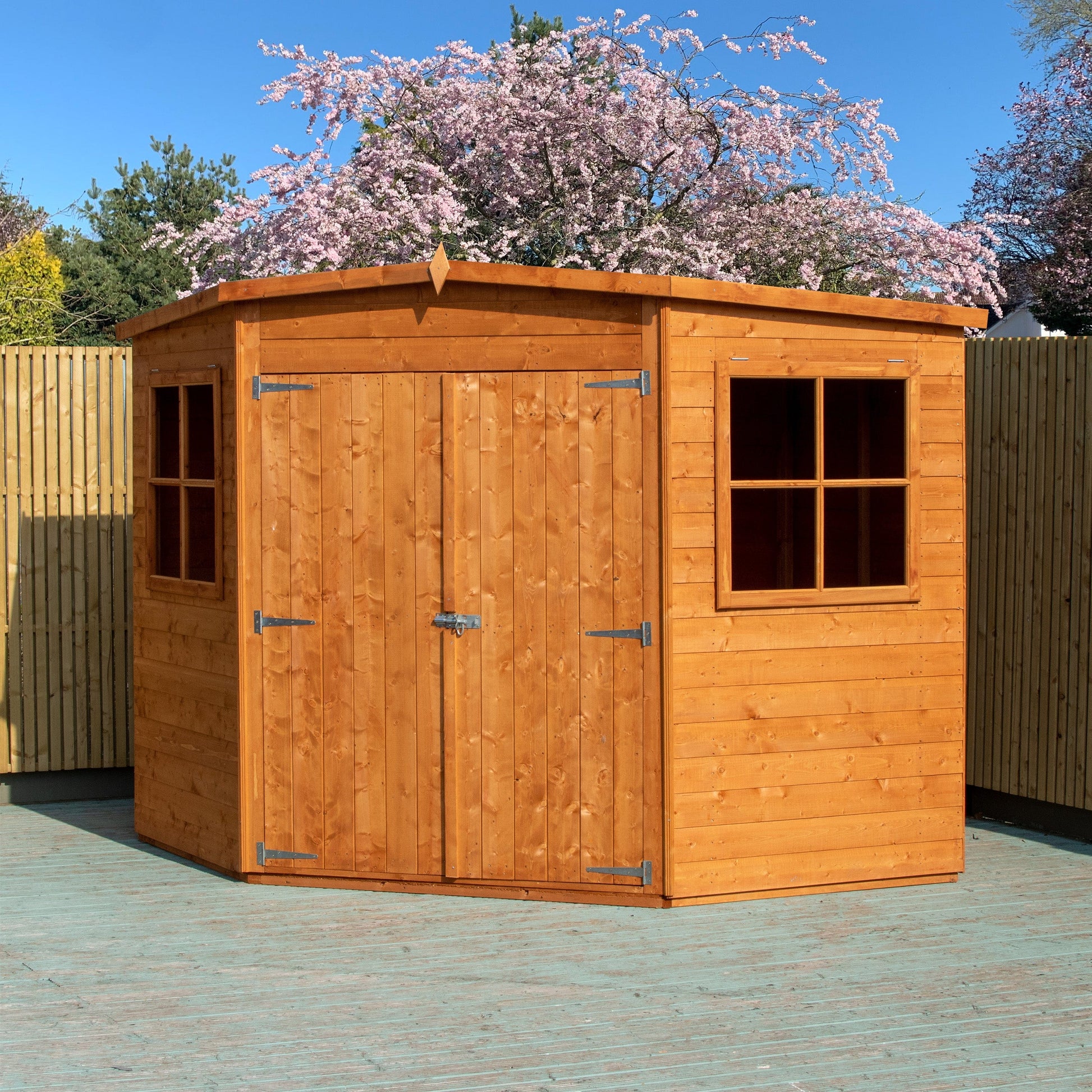 The Shire 7x7 Wooden T&G Shiplap Corner Shed is a sturdy, space-saving garden storage solution designed to fit snugly into any corner. Constructed from 12 mm tongue-and-groove FSC-certified pine and spruce over a 35 × 35 mm framework, with a solid OSB roof and T&G floor, it’s built for durability. Featuring wide double doors (1.36 × 1.70 m), two opening horticultural-glass windows, padbolt locking, and a honey-brown base-coat finish, it arrives flat-packed, ready for self-assembly or professional fitting. Ideal for tools, equipment or a compact workshop.