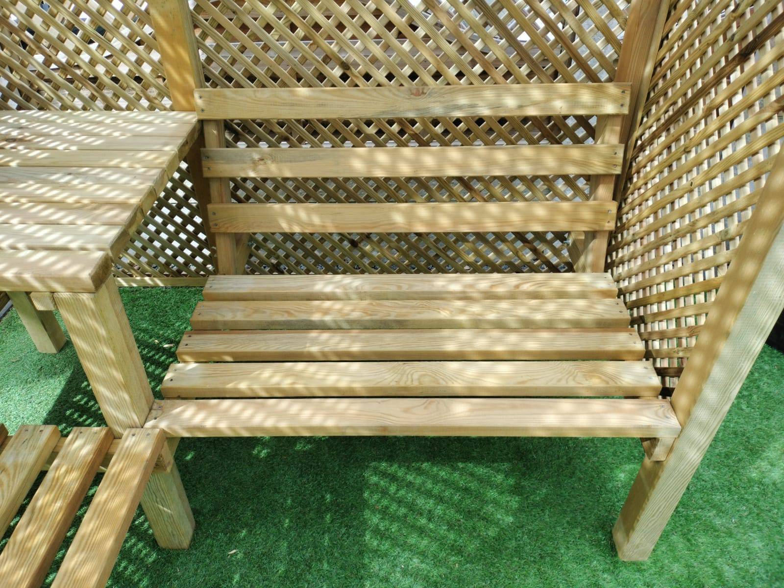 - Comfortable Seating: The arbour includes built-in benches on either side with a small central table, making it perfect for enjoying a drink, reading, or simply relaxing outdoors. The seating comfortably accommodates up to three people.