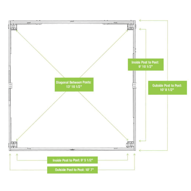 - Base (outside posts): 11' L x 10' 7" W (335cm x 323cm)