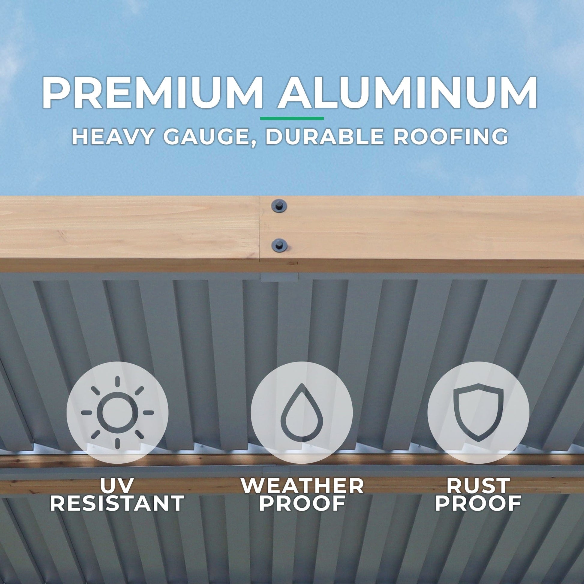 The Meridian 10 x 20 Premium Cedar Patio Shade Pergola with grey louvered roof panels and built-in gutter system is a spacious outdoor structure designed for versatile use, whether for dining, entertaining, or relaxing. Constructed from 100% premium cedar lumber, it features a natural cedar-coloured stain that withstands seasonal elements. The grey aluminium louvered roof is adjustable via a hand crank, allowing control over sunlight and shade. Six 6x6-inch posts with black plinths provide a solid foundation without obstructing views, and the integrated gutter system with four downspouts ensures effective rainwater drainage. All wood components are pre-cut, pre-drilled, and pre-stained for straightforward assembly.