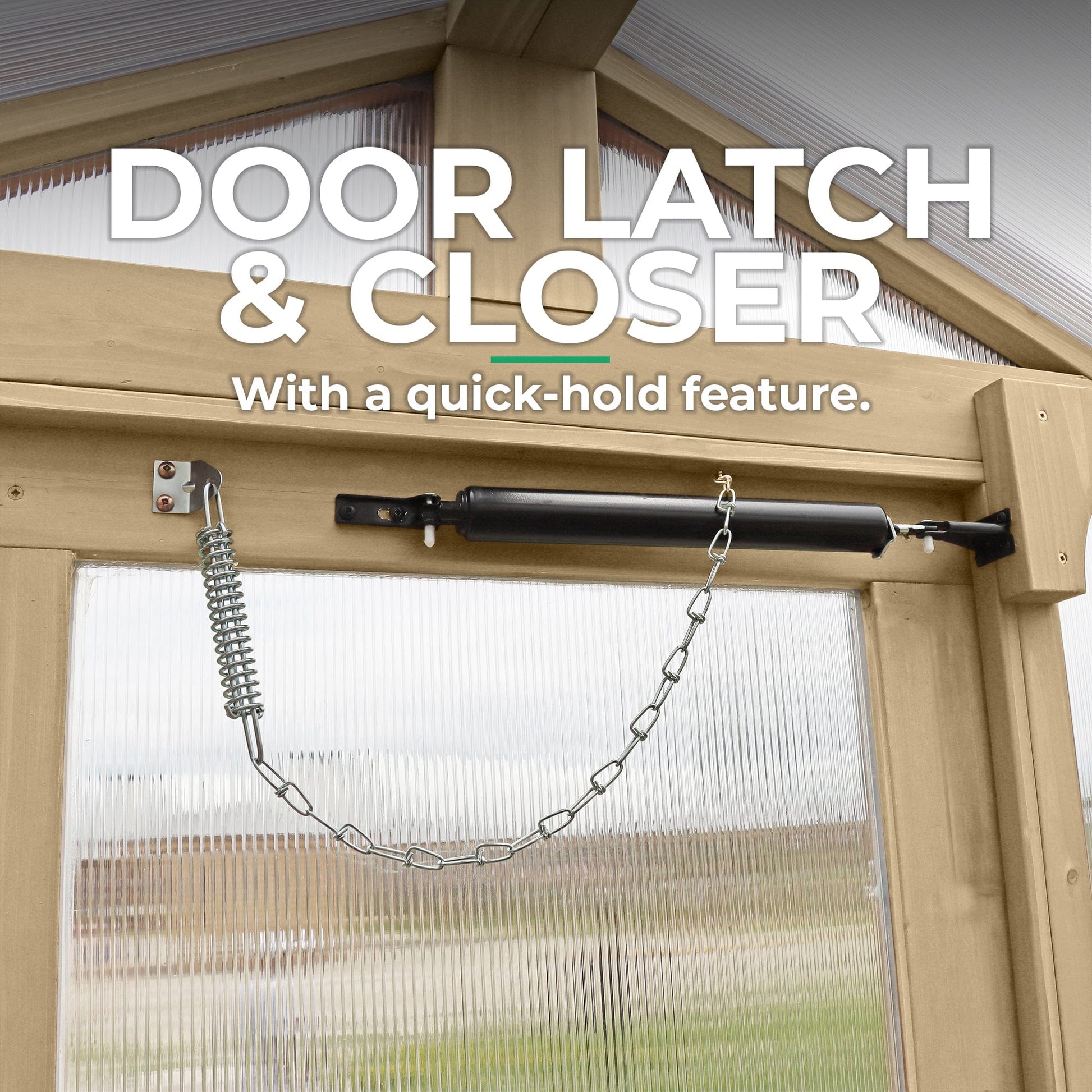 Secure Cedar Door – Equipped with a latch and closer with a quick-hold feature to keep the door open when desired.